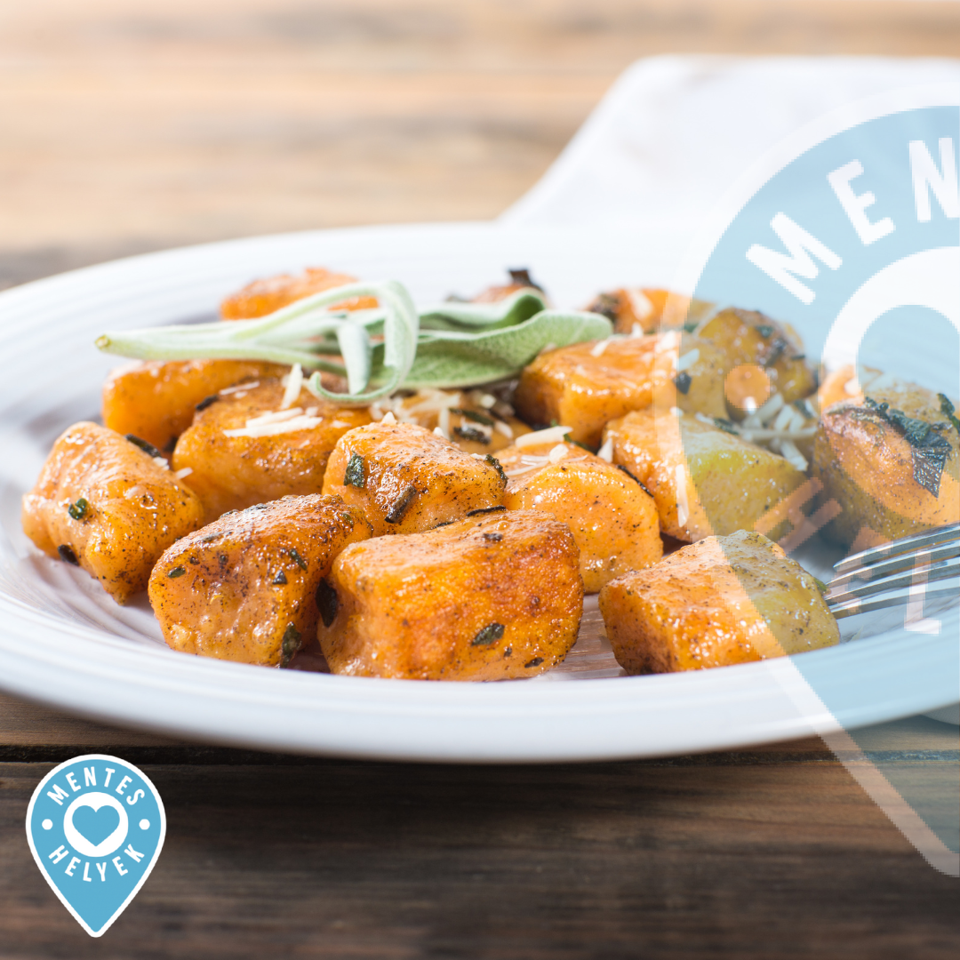 A sült édesburgonyát törjük át egy krumplinyomón. Adjuk hozzá a sót és apránként a gluténmentes lisztet. Gyúrjuk össze – egy lágy, de formázható tésztát kell kapnunk (ne legyen túl kemény). Lisztezett felületen sodorjunk belőle rudakat, vágjuk fel 2 centis darabokra, és villával nyomjuk meg a tetejüket. Lobogó sós vízben főzzük ki: ha feljönnek a víz tetejére, már készen is vannak (kb. 2 perc). Szűrjük le, és egy serpenyőben kevés olívaolajon, friss zsályalevelekkel pirítsuk át.