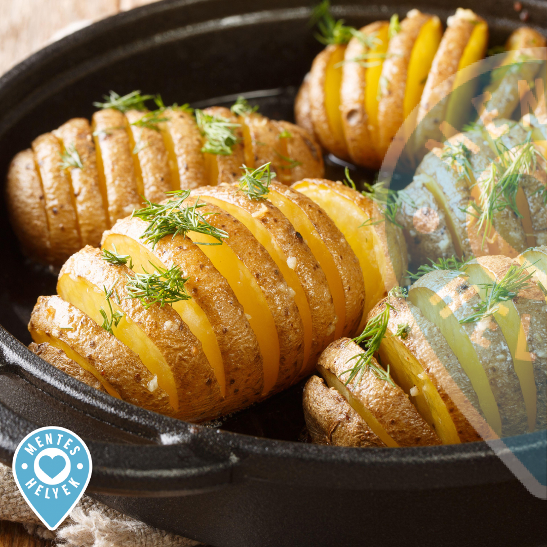A mikróban elősütött krumplikat elkezdjük bevagdosni úgy, hogy az aljuknál még épp ne vágjuk át őket, majd sütőpapírral bélelt tepsire helyezzük. Egy lábasban felolvasztjuk a laktózmentes vajat, amibe beletörjük a fokhagymákat, hozzáadjuk a rozmaringot is, és sózzuk, borsozzuk. Az egészet elkeverjük, majd a krumplikra locsoljuk. A résekbe még rozmaringágakat szurkálunk, hogy a zöldfűszer íze minél jobban átjárja a burgonyákat, majd az egész mehet be a sütőbe 180 fokra, 20 percre. 👌